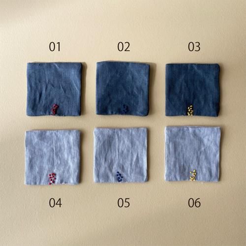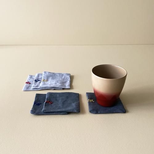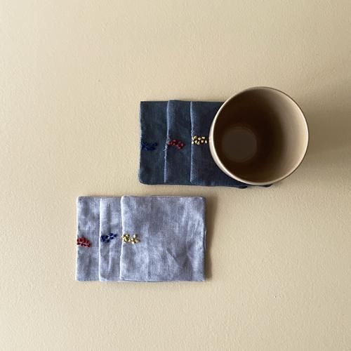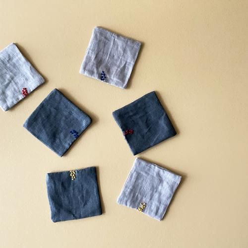 ドット柄の刺繡が可愛らしい、小さな正方形のリネンコースター。小さめのカップや小鉢にちょうど良いサイズです。