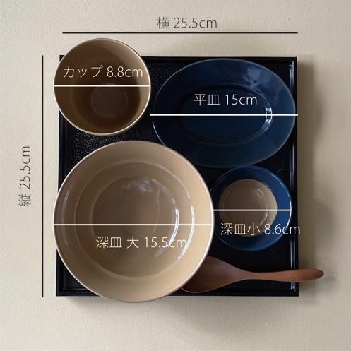 お盆の中で食器の配列が美しく整い、楽に持ち運びできる軽さが特徴です。